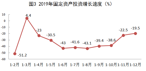 全年全社会固定资产投资比上年下降19.5%。其中,城镇项目投资比上年下降18.3%,占固定资产投资比重的77.7%。民间固定资产投资比上年下降47.4%,占固定资产投资的比重为27.7%。