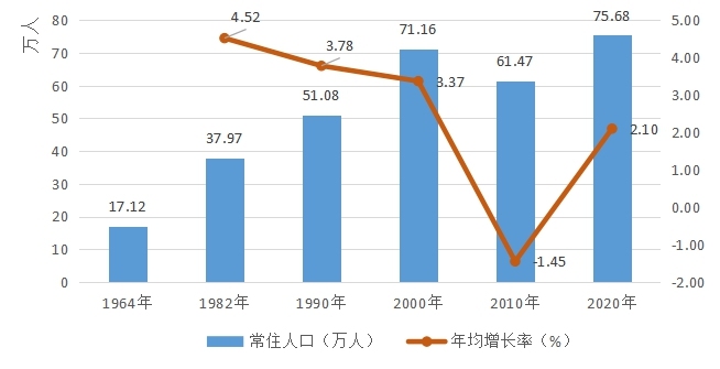全区常住人口与2010年第六次全国人口普查的614710人相比,增加142130人,增长23.12%,年平均增长率为2.10%。
