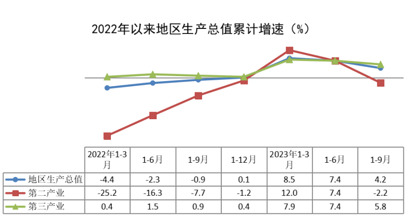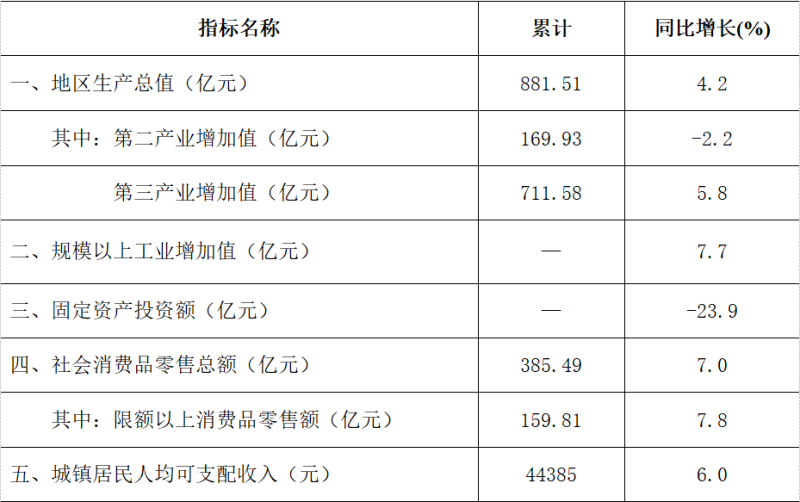 根据地区生产总值统一核算结果,前三季度,全区地区生产总值881.51亿元,按不变价格计算,同比增长4.2%,比上半年回落3.2个百分点。分产业看,第二产业增加值169.93亿元,同比下降2.2%;第三产业增加值711.58亿元,同比增长5.8%。