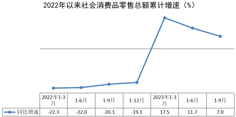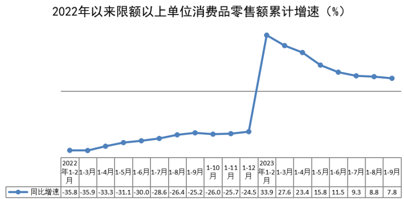 前三季度,全区社会消费品零售总额385.49亿元,同比增长7.0%,比上半年回落4.7个百分点。其中,限额以上单位消费品零售额159.81亿元,同比增长7.8%,比上半年回落3.7个百分点。按消费形态分,商品零售同比增长4.3%,餐饮收入同比增长36.7%。
