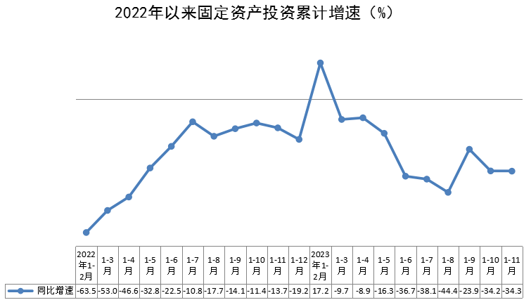 1-11月,全区固定资产投资同比下降34.3%,比1-10月加深0.1个百分点。其中,民间投资同比下降48.1%。