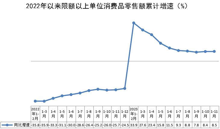 1-11月,全区限额以上单位消费品零售额198.06亿元,同比增长8.5%,比1-10月提升0.1个百分点。按消费形态分,商品零售同比增长4.7%,餐饮收入同比增长43%。