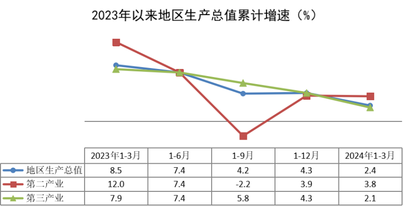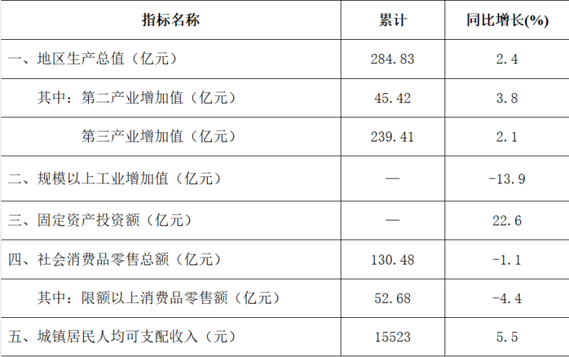 根据地区生产总值统一核算结果,一季度,全区地区生产总值284.83亿元,按不变价格计算,同比增长2.4%,比上年同期回落6.1个百分点。分产业看,第二产业增加值45.42亿元,同比增长3.8%;第三产业增加值239.41亿元,同比增长2.1%。