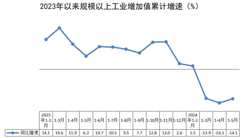 1-5月,全区规模以上工业增加值同比下降14.1%,降幅比1-4月收窄2.0个百分点。