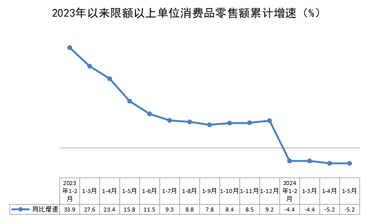 1-5月,全区限额以上单位消费品零售额90.37亿元,同比下降5.2%,降幅与1-4月持平。按消费形态分,商品零售同比下降6.0%,餐饮收入同比增长1.5%。
