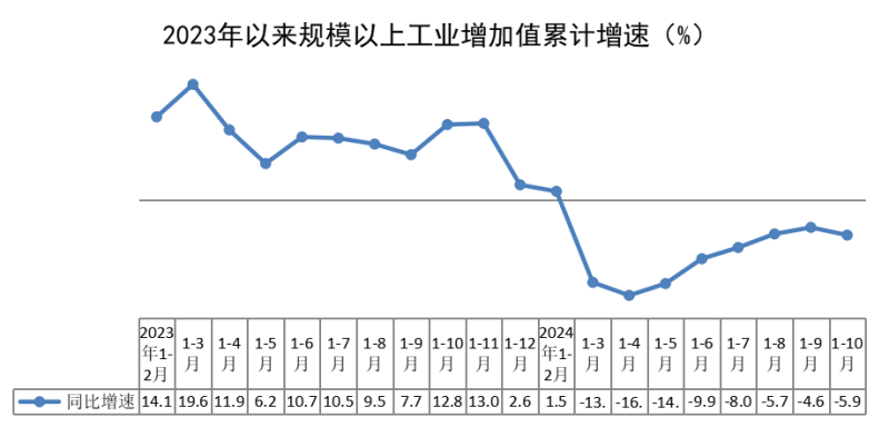 1-10月,全区规模以上工业增加值同比下降5.9%,降幅比1-9 月加深1.3个百分点。