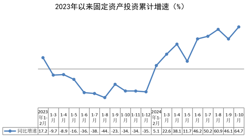 1-10月,全区固定资产投资同比增长64.7%,比1-9月提升18.6个百分点。其中,民间投资同比增长7.8%。