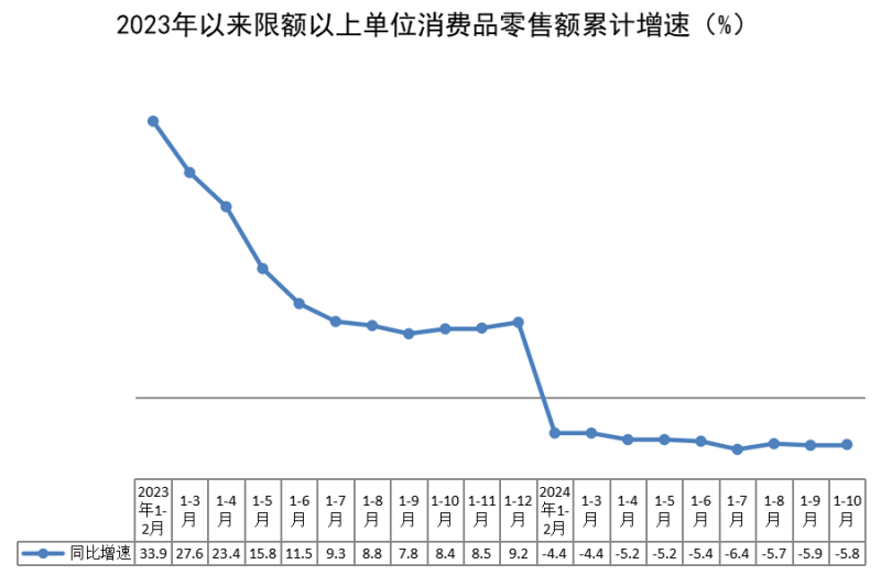1-10月,全区限额以上单位消费品零售额169.30亿元,同比下降5.8%,降幅比1-9月收窄0.1个百分点。按消费形态分,商品零售同比下降6.2%,餐饮收入同比下降3.4%。