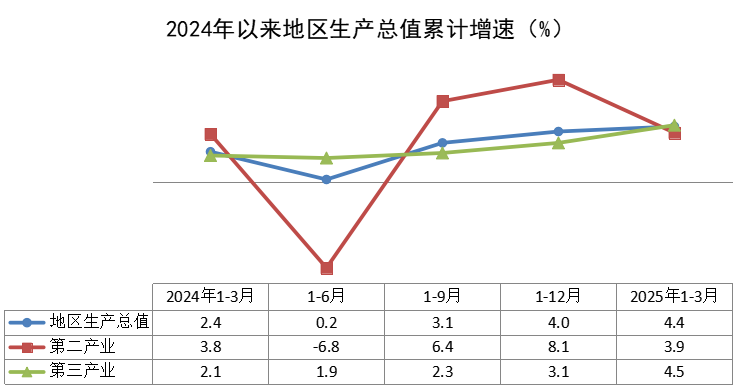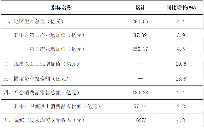 根据地区生产总值统一核算结果,一季度,全区地区生产总值294.06亿元,按不变价格计算,同比增长4.4%,比上年同期提高2个百分点。分产业看,第二产业增加值37.89亿元,同比增长3.9%;第三产业增加值256.17亿元,同比增长4.5%。