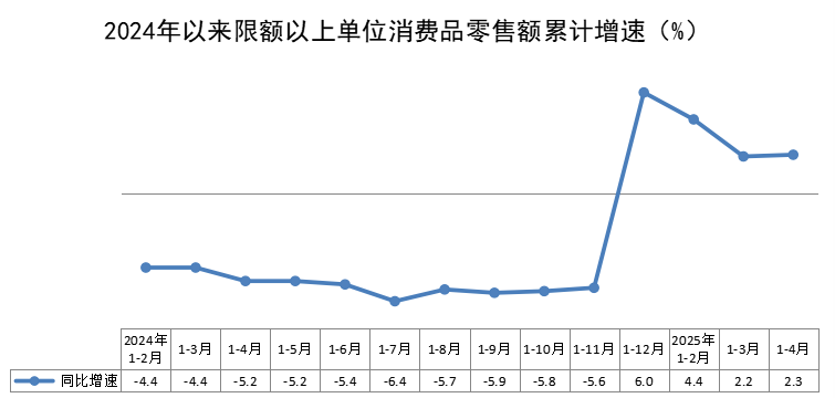 1-4月,全区限额以上单位消费品零售额79.08亿元,同比增长2.3%,比上年同期回升个百分点。按消费形态分,商品零售同比增长3.6%,餐饮收入同比下降6.9%。