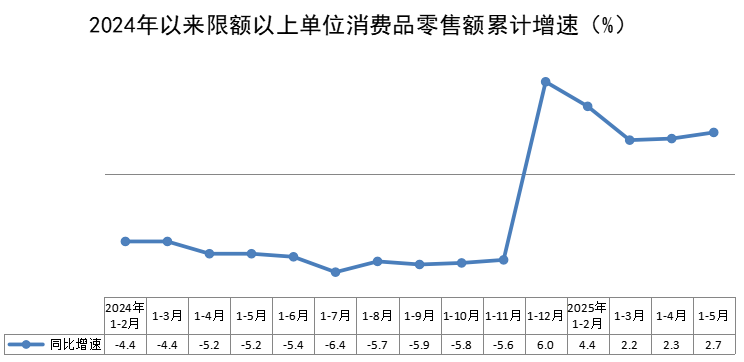 1-5月,全区限额以上单位消费品零售额97.90亿元,同比增长2.7%,比上年同期回升7.9个百分点。按消费形态分,商品零售同比增长3.9%,餐饮收入同比下降6.4%。