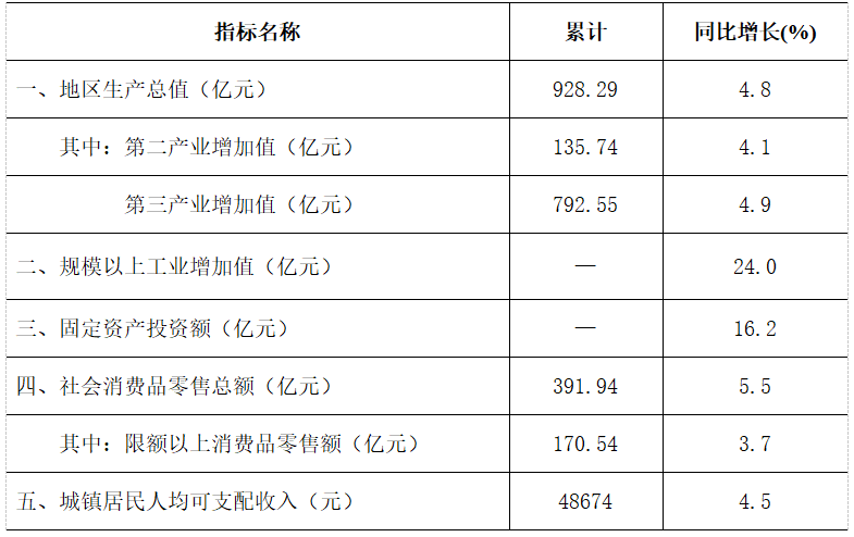 根据地区生产总值统一核算结果,上半年,全区地区生产总值928.29亿元,按不变价格计算,同比增长4.8%,比上年同期提高1.7个百分点。分产业看,第二产业增加值135.74亿元,同比增长4.1%;第三产业增加值792.55亿元,同比增长4.9%。