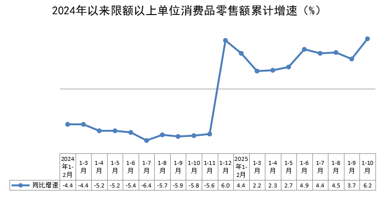 1-10月,全区限额以上单位消费品零售额192.39亿元,同比增长6.2%,比上年同期回升12个百分点。按消费形态分,商品零售同比增长8.3%,餐饮收入同比下降7.7%。