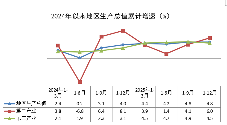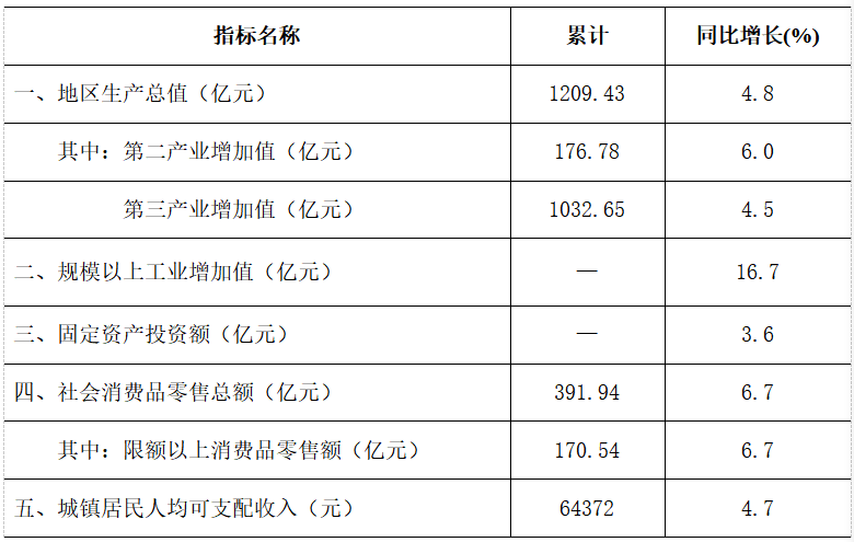 根据地区生产总值统一核算结果,2025年,全区地区生产总值1209.43亿元,按不变价格计算,同比增长4.8%,与前三季度持平。分产业看,第二产业增加值176.78亿元,同比增长6%;第三产业增加值1032.65亿元,同比增长4.5%。