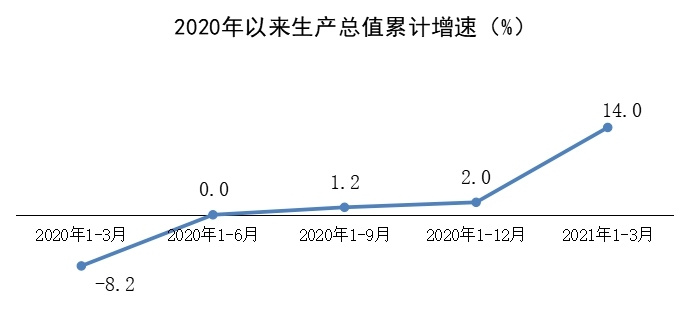 根据区(县)生产总值统一核算结果,2021年一季度我区生产总值为257.46亿元,同比增长14%,比2019年同期增长4.7%,两年平均增长2.3%。