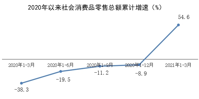 一季度,全区社会消费品零售总额完成142.86亿元,同比增长54.6%,比2019年同期下降4.6%,两年平均下降2.3%。其中,限额以上消费品零售额完成65.69亿元,同比增长66.5%,比2019年同期增长2.9%,两年平均增长1.4%。从消费形态看,商品零售收入同比增长62.3%;餐饮收入同比增长127.9%。