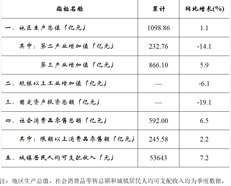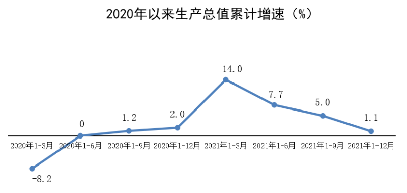 根据区(县)生产总值统一核算结果,2021年地区生产总值1098.86亿元,同比增长1.1%,比上年回落0.9个百分点;两年平均增长1.5%,低于2019年增速4.5个百分点。