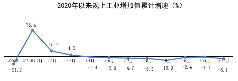 2021年,全区规上工业增加值同比下降6.1%,比上年回升15.1个百分点;两年平均下降14%,低于2019年增速13.5个百分点。