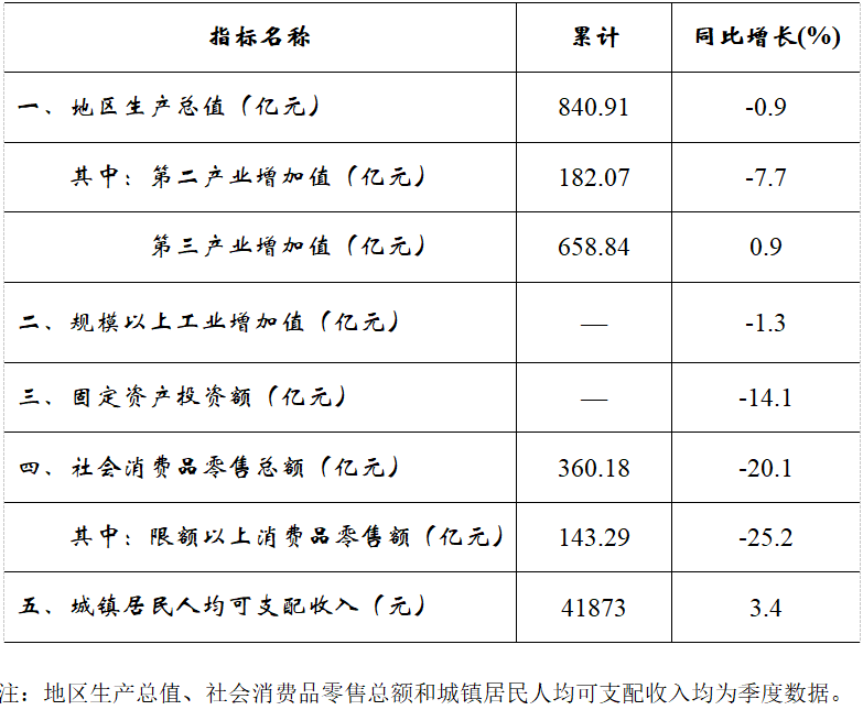 根据区(县)生产总值统一核算结果,前三季度,全区地区生产总值840.91亿元,同比下降0.9%,比上半年回升1.4个百分点。分产业看,第二产业增加值182.07亿元,同比下降7.7%;第三产业增加值658.84亿元,同比增长0.9%。
