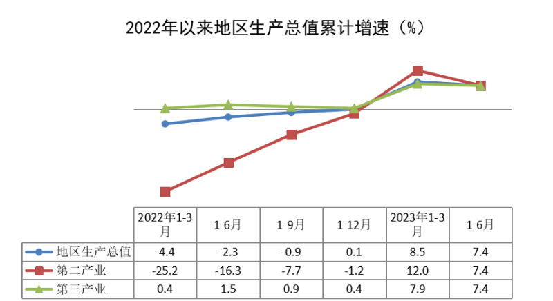 根据地区生产总值统一核算结果,上半年,全区地区生产总值598.28亿元,按不变价格计算,同比增长7.4%,比一季度回落1.1个百分点。分产业看,第二产业增加值121.82亿元,同比增长7.4%;第三产业增加值476.46亿元,同比增长7.4%。