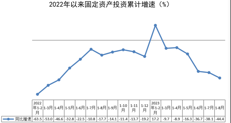 1-8月,全区固定资产投资同比下降44.4%,比1-7月加深6.3个百分点。其中,民间投资同比下降55.5%。