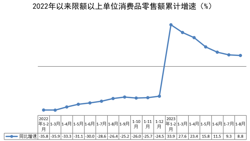 1-8月,全区限额以上单位消费品零售额143.46亿元,同比增长8.8%,比1-7月回落0.5个百分点。按消费形态分,商品零售同比增长5.3%,餐饮收入同比增长38.3%。