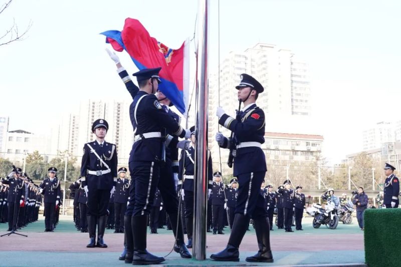上午9时,仪式正式开始。护旗手迈着铿锵有力、整齐划一的步伐,护卫着红蓝相间的警旗走向升旗台。伴随着雄壮激昂的《中国人民警察警歌》旋律,全体民警目光如炬、高唱警歌,面向缓缓升起的警旗庄严敬礼。警旗在蓝天映衬下猎猎飘扬,犹如跳动的忠诚火焰,点燃了大家心中的热血与豪情。