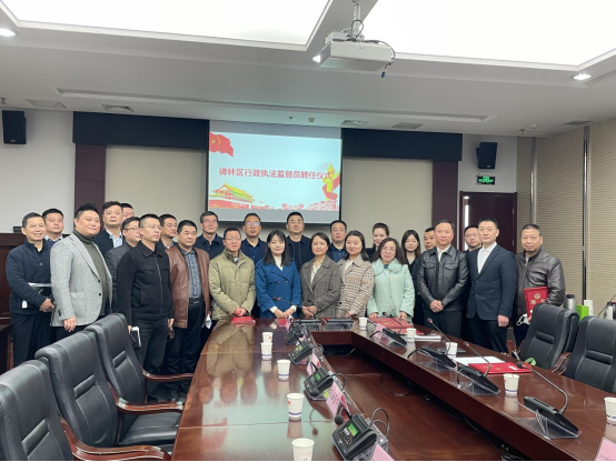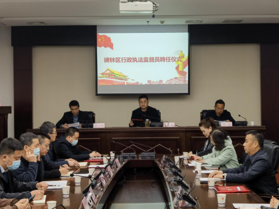 为进一步推进法治政府建设,加强行政执法监督,规范行政执法行为,提升行政执法能力和水平,3月23日上午,碑林区举办行政执法监督员聘任仪式。区委常委、政法委书记、依法治区办主任聂文斌出席会议并讲话。区司法局局长周琦主持会议,区司法局、区市场监管局、区卫健局、区城市管理和综合执法局各分管领导,各行政执法监督员参加会议。