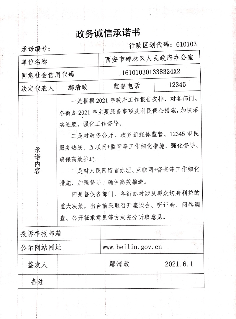 碑林区人民政府办公室政务诚信承诺书