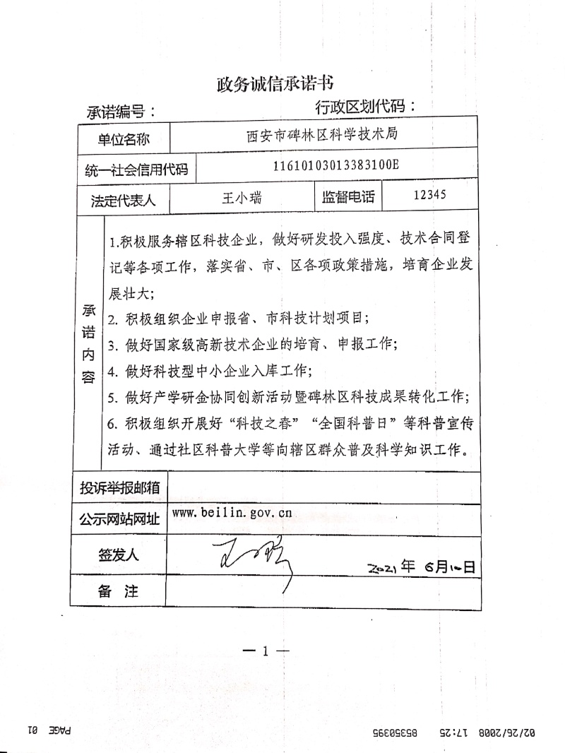 碑林区科学技术局政务诚信承诺