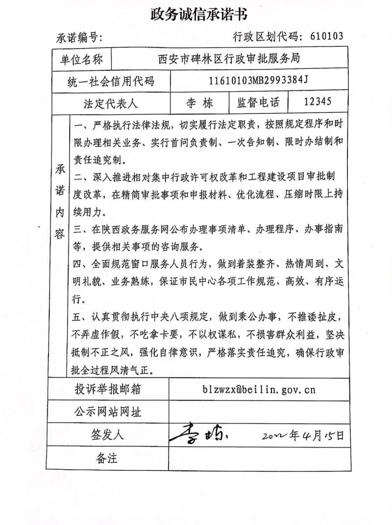 碑林区行政审批服务局政务诚信承诺
