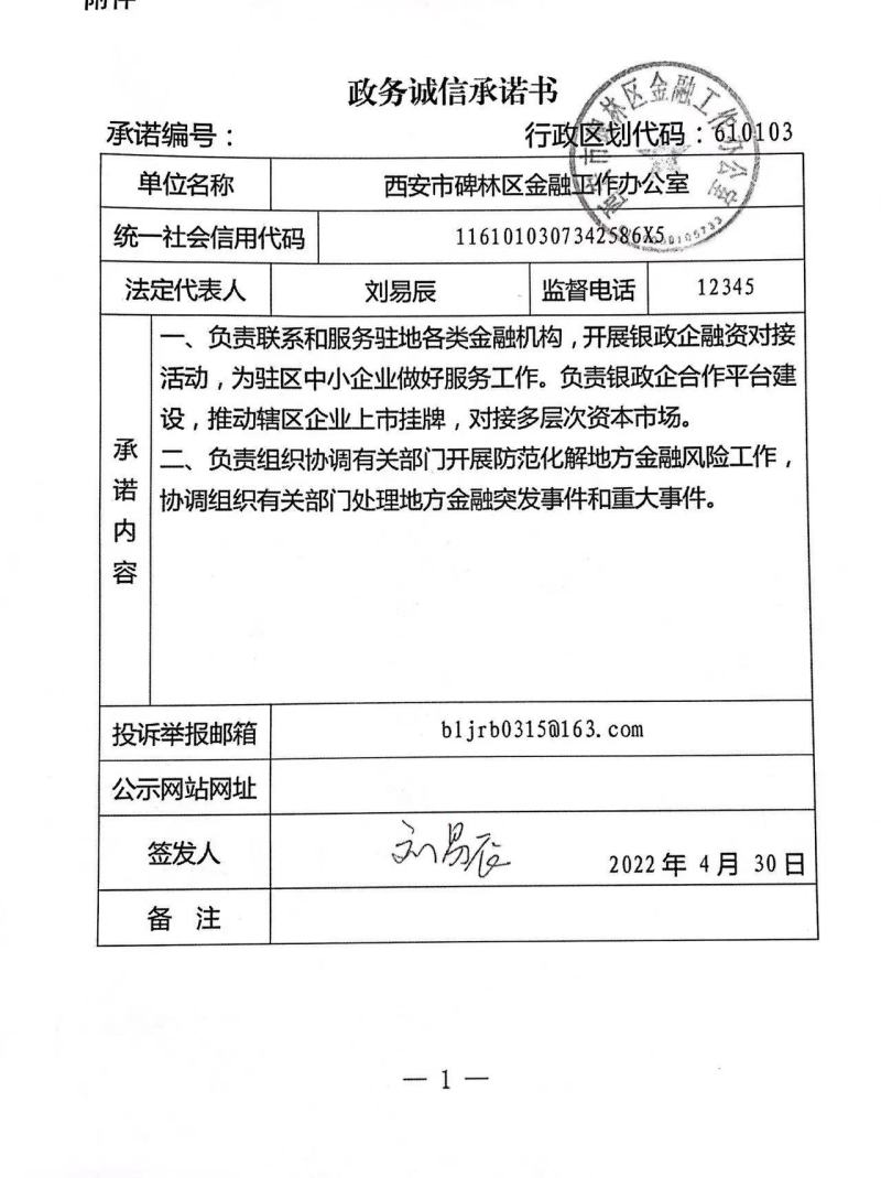 碑林区金融工作办公室政务诚信承诺