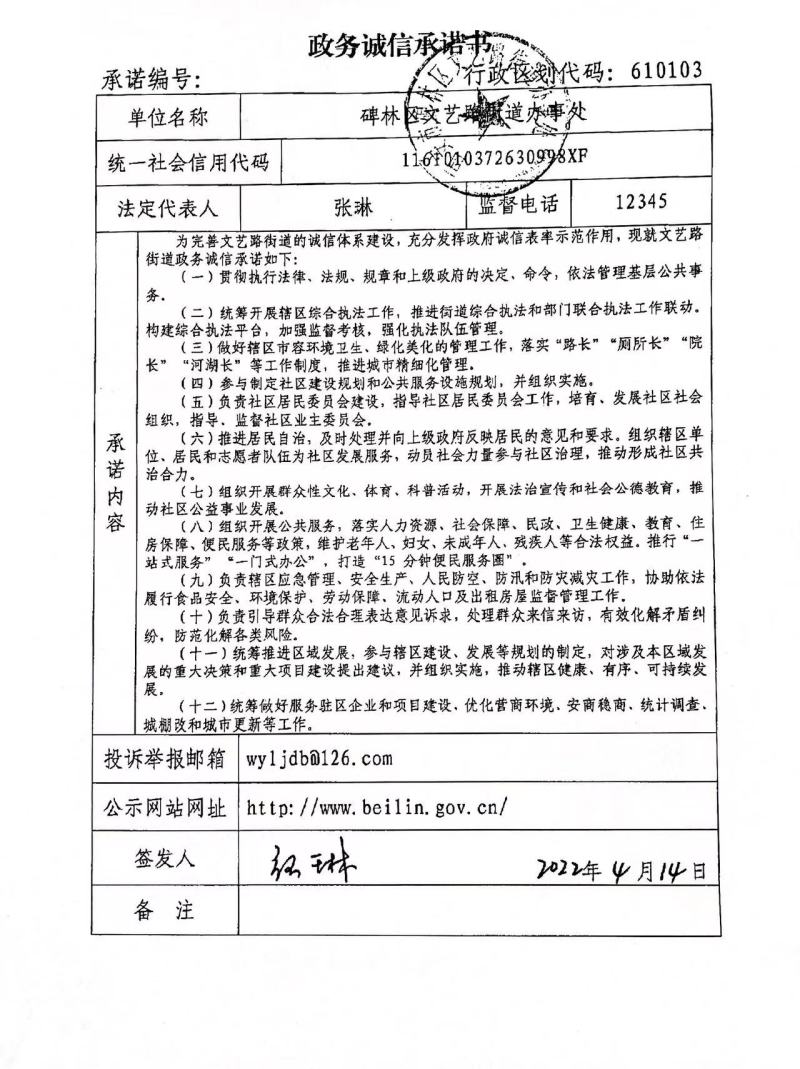 碑林区文艺路街道办事处政务诚信承诺