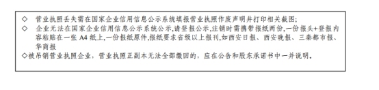 1.执照丢失:(1)登录“国家企业信用信息公示系统”中“企业信息填报”模块进行营业执照丢失网上公示(无法登录的请选择登报公示),公示页面截图打印盖章后携带至窗口。(2)或请登报(西安日报、西安晚报、三秦都市报、华商报等省级以上有影响力的报刊)声明遗失作废,携带原件至窗口。