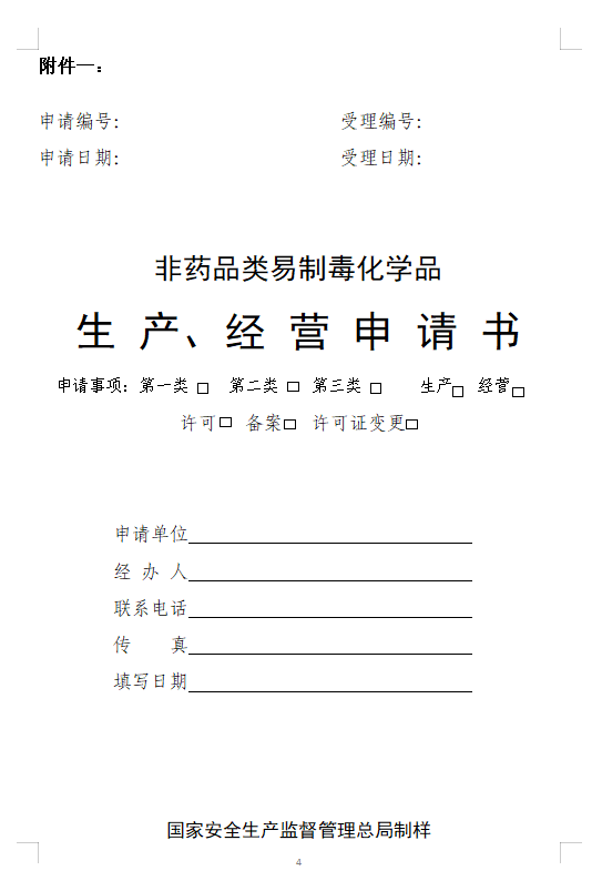 一、本申请书封面“申请编号”、“申请日期”、“受理编号”、“受理日期”和“表5、审查意见表”由非药品类易制毒化学品生产、经营许可管理部门填写,本申请书的其他内容由非药品类易制毒化学品生产、经营单位填写。