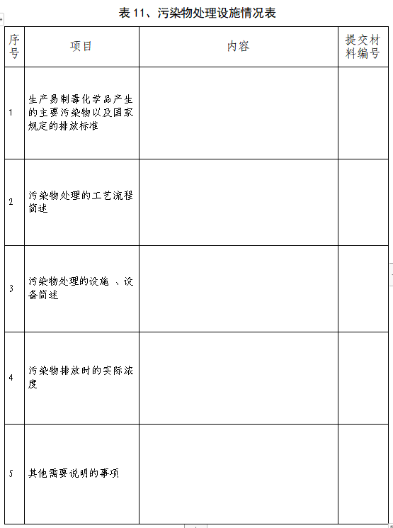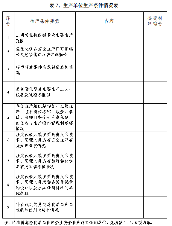 由生产单位根据《易制毒化学品管理条例》对本单位生产条件进行概述,其中“提交材料编号”栏,填写表6中提交材料的序号。其中“3.环境突发事件应急预案结构情况”,是指对该预案包括的主要内容方面进行概述,如是否有指挥、执行机构设置与职责,预防措施,应急响应和应急保障措施,后期处置程序等内容。