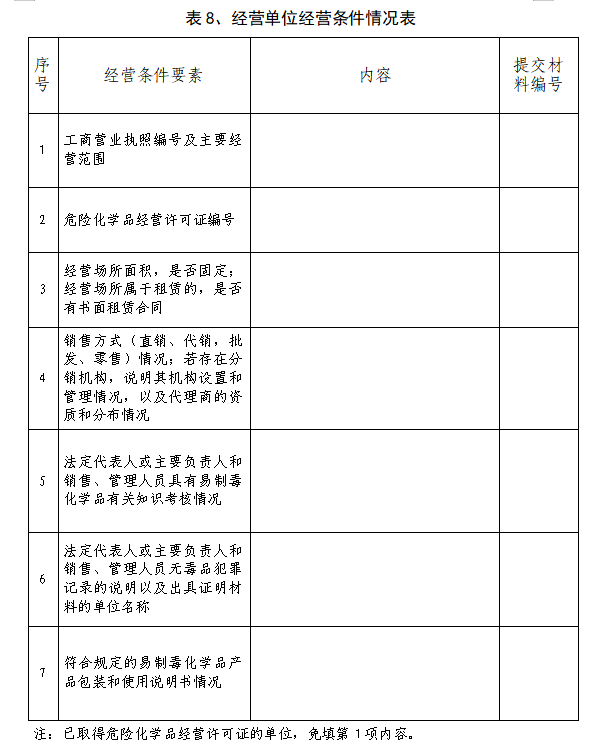 由经营单位根据《易制毒化学品管理条例》对本单位经营条件进行概述,其中“提交材料编号”栏,填写表6中提交材料的序号。