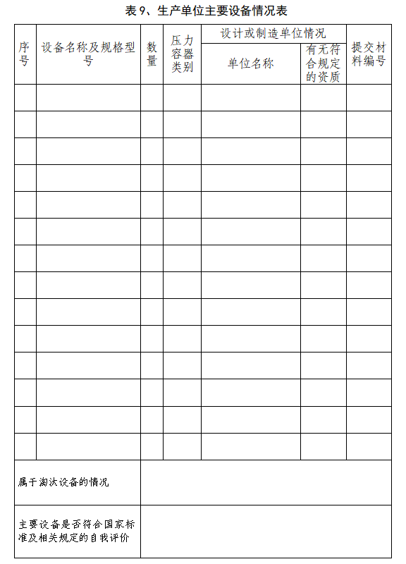 (九)表9、生产单位主要设备情况表