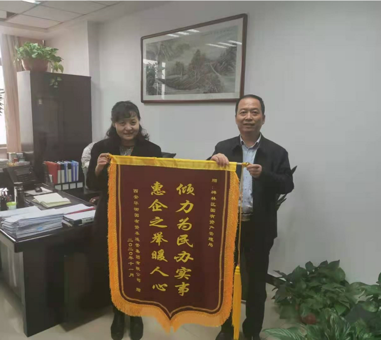 11月27日上午,西安市华衡集团副总经理王岗曼一行来到碑林区剥离办,送上了一面写着“倾力为民办实事,惠企之举暖人心”的锦旗,感谢区剥离办对企业的支持与帮助。