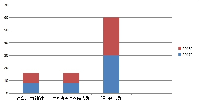 截止2018年底,本部门人员编制8人,其中行政编制8人,实有人员8人。另,区委一般每轮巡察设立巡察组3个,每组抽调人员约10人,共30人。