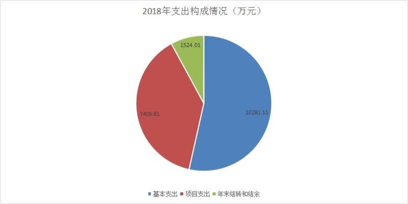 2018年度一般公共预算财政拨款基本支出10281.11万元,其中:人员经费10227.12万元,公用经费53.99万元,用于保障机构正常运转、完成日常工作任务。较去年减少8250.82万元,下降44.52%,下降原因为调整科目“2080505机关事业单位基本养老保险缴费支出”到财政进行核算。
