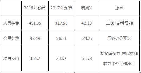 2018年本部门机关运行经费财政拨款预算42.49万元,比2017年预算减少13.62万元,下降24.27%,原因是压缩办公经费。
