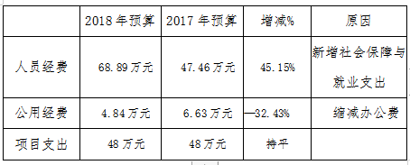 2018年本部门机关运行经费财政拨款预算4.84万元,比2017年预算减少1.79万元,下降32.43%,原因是节约经费。