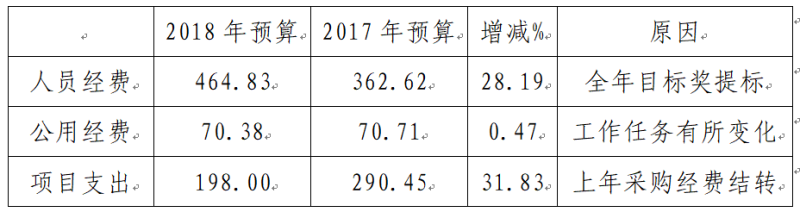 2018年本部门机关运行经费财政拨款预算70.38万元,比2017年预算减少0.33万元,下降0.5%,原因是2018年人员调整导致办公经费减少。