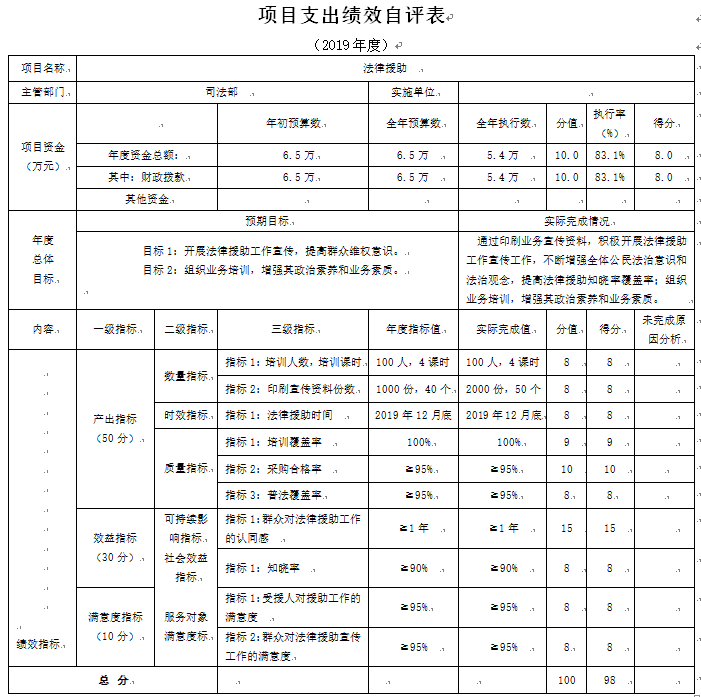 财政资金的重点评价与检查项目绩效自评综述:根据年初设定的绩效目标,项目自评得分98分。项目全年预算数6.5万元,执行数5.4万元,完成预算的83.1%。主要产出和效果:通过对重点项目进行绩效评价和部门财会相关事项的重点检查,有序推进了全局绩效管理工作,提高了部门财会人员遵纪守法意识和财政资金使用效益。同时,通过开展系列宣传活动,不断增强全体公民法治意识和法治观念,提高法律援助知晓率覆盖率。发现的问题及原因:经费支出进度较慢,需要改进和提高。下一步改进措施:需要进一步加强预算绩效管理相关政策宣传和业务指导,努力提高部门财会业务知识和实操水平,不断完善全面规范透明、标准科学、约束有力的预算制度,切实提高财政资源配置效率和财政资金使用效益,做好经费规划支出,加大资金支出力度。