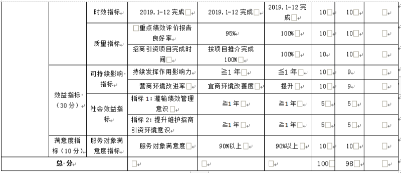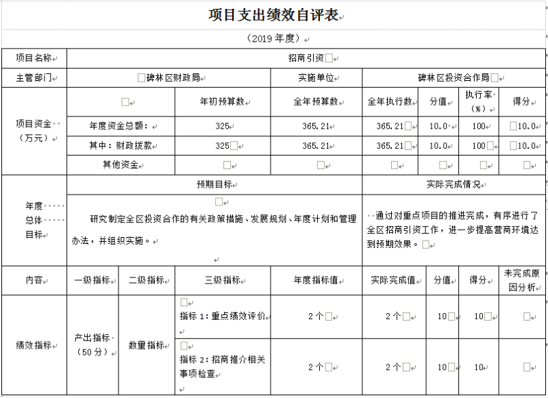 招商引资项目绩效自评综述:根据年初设定的绩效目标,项目自评得分98分。项目全年预算数325万元,执行数387.53万元,完成预算的119.2%。主要产出和效果:通过项目实施整体绩效管理,建立健全合同内部管理制度和绩效管理制度,初步构建了“预算编制有目标、预算执行有监控、预算完成有评价、评价结果有反馈、反馈结果有应用”的预算绩效管理机制。积极推进信息化建设,提高预算绩效管理的效率。各预算指标较为明确,部门整体的绩效目标细化分解到位。根据实际完成情况发现的主要问题是可持续影响指标里持续发挥作用影响力不足一年,营商环境改善度还有待继续提升。下一步改进措施:需要进一步加强预算绩效管理相关政策宣传和业务指导,努力提高部门财会业务知识和实操水平,继续推进提升项目可持续性。