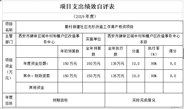 根据预算绩效管理要求,本部门组织对 2019年一般公共预算项目支出全面开展绩效自评。其中,此次开展的自评项目为“撤村新建社区无形改造工作清产核资”,共涉及资金135万元,占一般公共预算项目支出总额的90%。2019年,我部门无政府性基金预算项目支出。