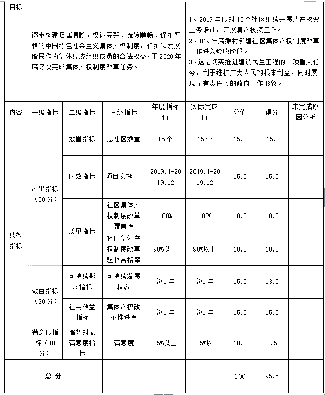 财政资金的重点评价与检查项目绩效自评综述:根据年初设定的绩效目标,项目自评综合得分95.5分。项目全年预算数150万元,执行数135万元,完成预算的90%。主要产出和效果:通过项目实施明晰集体所有产权关系,发展新型集体经济;管好用好集体资产,建立符合市场经济要求的集体经济运行新机制,促进集体资产保值增值,提高经济效益;改善我区社区居民生活环境。发现的主要问题:存在交叉管理。下一步改进措施:提高工作效率,继续加强完善集体产权制度改革,加强人才队伍建设,培育一批现代复合型人才。