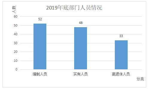 截止2019年底,本部门人员编制52人,其中参照公务员法管理的编制人数为16人、全额事业编制人数为36人;实有人员48人,其中参照公务员法管理的人数为13人、全额事业人数为35人。单位管理的离退休人员33人。