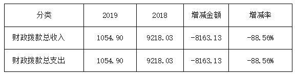 2019年财政拨款总收入为1054.90万元,较上年减少8163.13万元,下降88.56%,主要原因是城棚改拆迁补偿建设费用和安置补助项目资金减少。